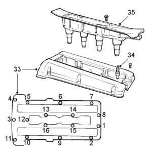 33. Apply soap to the open end of the camshaft cover and fit the cover, starting at the open end. Then tighten the bolt located furthest to the front at the timing end. Then continue all the way round, on both the inside and outside.