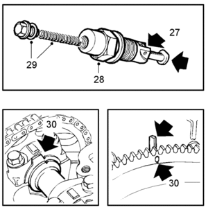 29. Fit the plug for the chain tensioner with push rod and spring.