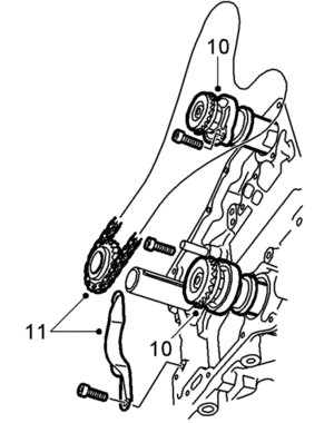 12. First fit the fixed chain guide, which is common to the timing chain and balance-shaft chain, and then the pivoted chain guides for the timing and balance-shaft chains.