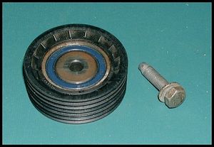 The serpentine belt, idler and tensioner pulleys should be inspected every service interval and in theory, replaced every 60k miles, but a pulley bearing often fails earlier. Cost of replacing two pulleys and the belt can be $200-300 for parts and labor plus towing. Alternatives include replacement as preventive maintenance (about $100 for a new belt and two pulleys), the short belt conversion ($60-70 for one pulley and the belt), and aluminum pulleys with replacable bearings. Repacking the pulley bearings is also possible to extend their life.
