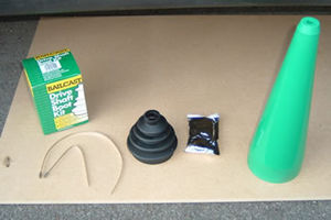 The boot kit is made by a company called Bailcast and consists of the boot, a sachet of grease and the metal clips to secure the boot. The cone for fitting, seen on the right, was purchased separately but it is reusable. (My local Unipart/Partco had them all in stock)