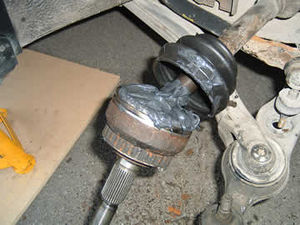 After dismantling and the front suspension assy. and removing the strut. The old, torn gaiter was cut off and the CV joint cleaned up.