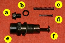 The 12-mm spring retaining cap must be removed first, otherwise the tensioner will extend fully while it is being removed! The spring and plastic pin come next. The tensioner housing is taken out last. It can take a fair amount of force to break the housing loose, then it can be unscrewed by hand, carefully to keep the tensioner pluger from moving.