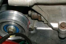Tensioner position behind idler pulley. The picture shows the tensioner housing with the off-center spring retaining cap at the end. The pulley was also removed because the pulley bolt did not allow enough clearance for the 27-mm socket used on the tensioner housing. A standard socket may be a better fit than the long socket shown below.
